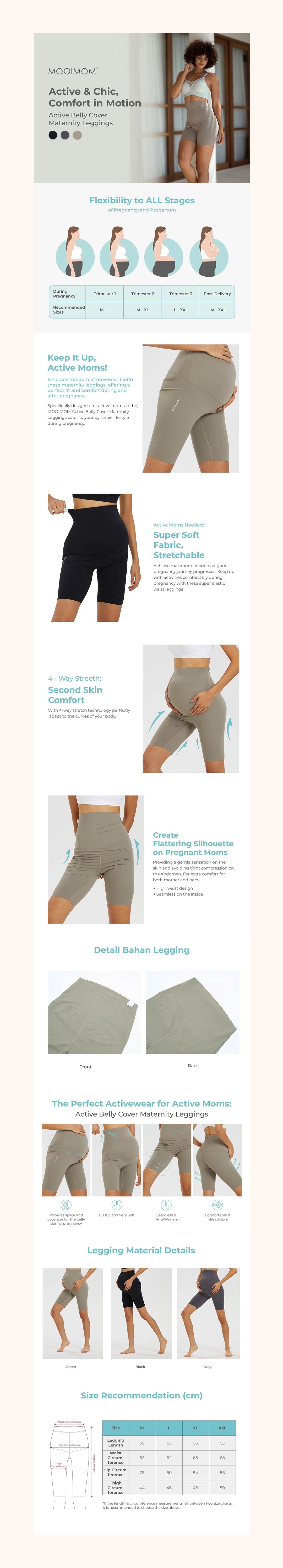 The MOOIMOM Active Belly Cover Maternity Leggings (Short) offer a comfortable fit suitable for both during and after pregnancy. Their seamless design, without inner seams, guarantees a soft and comfortable feel. Designed for active expectant mothers with a bustling lifestyle, these leggings provide maximum freedom as the pregnancy progresses.